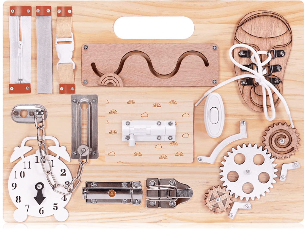This simple wood fine motor board (or busy board) will help your little one learn multiple fine motor skills involved in dressing himself, encouraging independence and confidence!