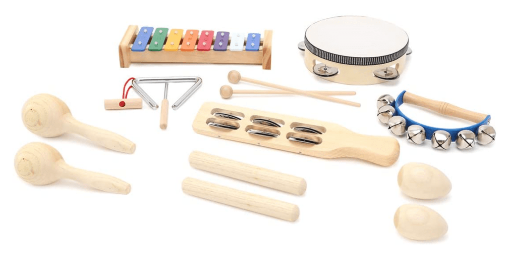 This set is great because it includes all of the basic musical instruments that are appropriate for a toddler. Maracas, tambourine, xylophone, a triangle, and more.