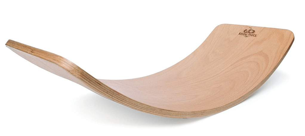This balance board can be used as a slide off the edge of a sofa, as a rounded shelf for balancing toys, a “bridge” for kids to climb over and crawl under, or as a balance board for kids to stand on.