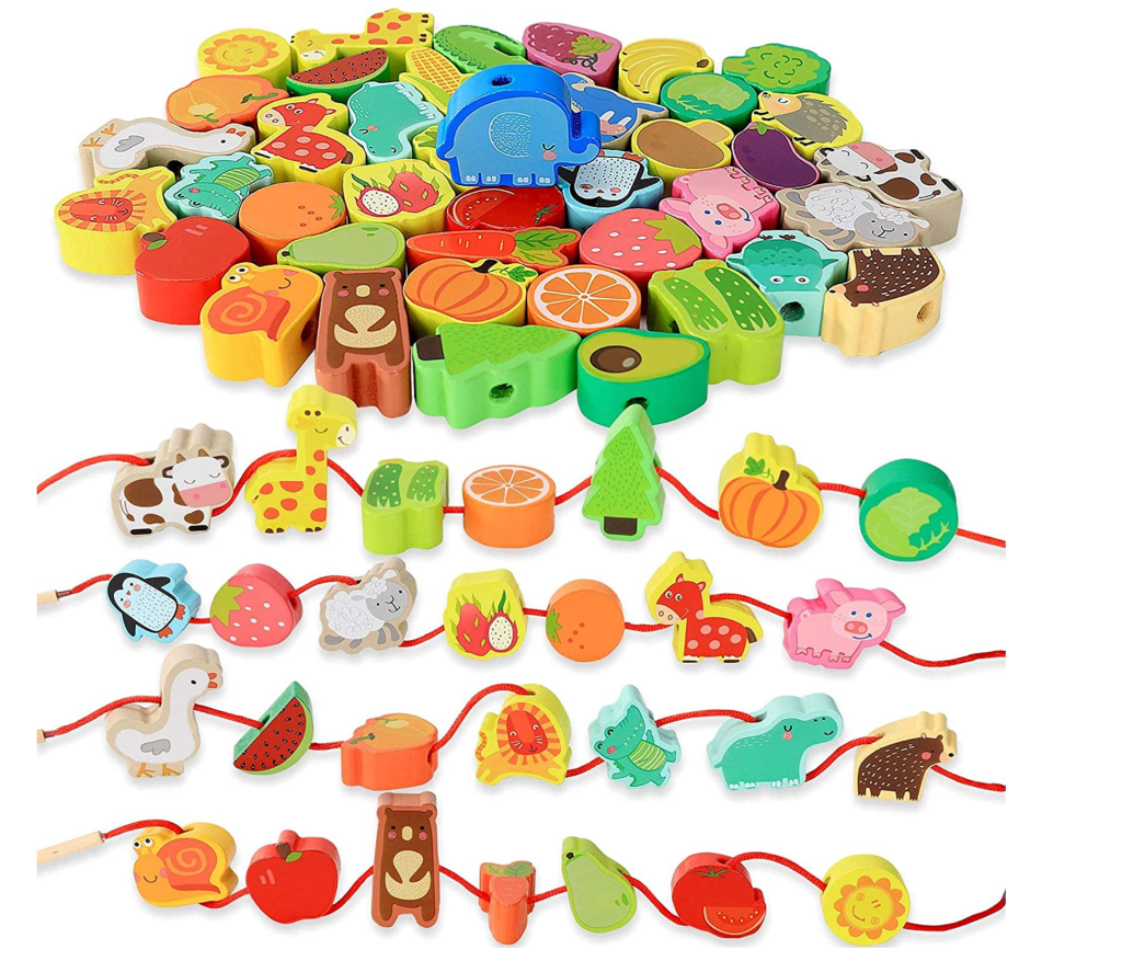 14. Threading Toys Wooden Stringing | Farm Animals + Fruits