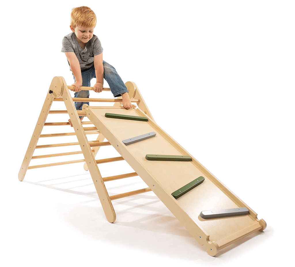 Open ended play inspired kids climbing triangle promotes balance, fine and gross motor skills, plus imagination and creative play! This 3 piece natural wood indoor gym will keep your child entertained in so many ways, while developing coordination and muscle development.