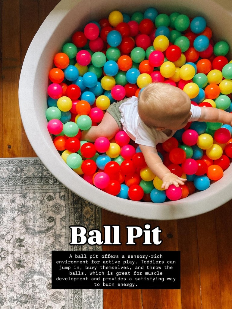 4. Ball Pit A ball pit is a sensory-rich environment that offers a wonderful way to burn energy. Jumping into, wading through, and throwing the balls provides a full-body workout. It also helps with tactile sensory input and encourages cause-and-effect learning as they interact with the balls.