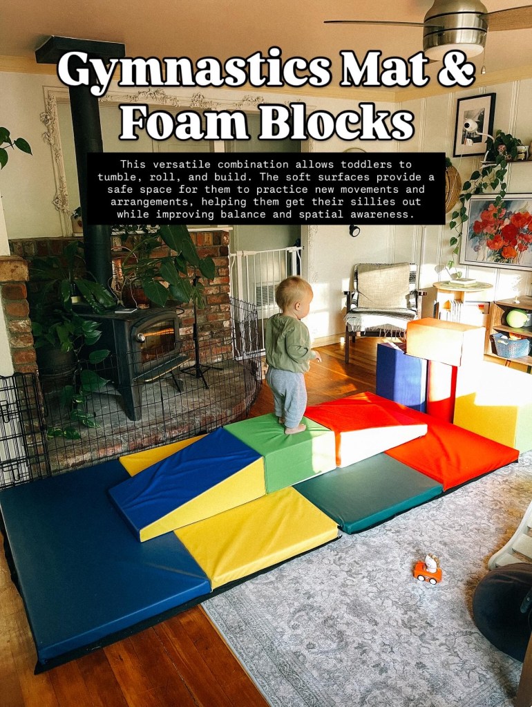 3. Gymnastics Mat and Foam Blocks This versatile combination is perfect for creative, high-energy play. Toddlers can build their own obstacle courses, practice tumbling, or simply jump and roll around on the soft, safe surface. This kind of unstructured play is great for both physical development and imaginative fun.